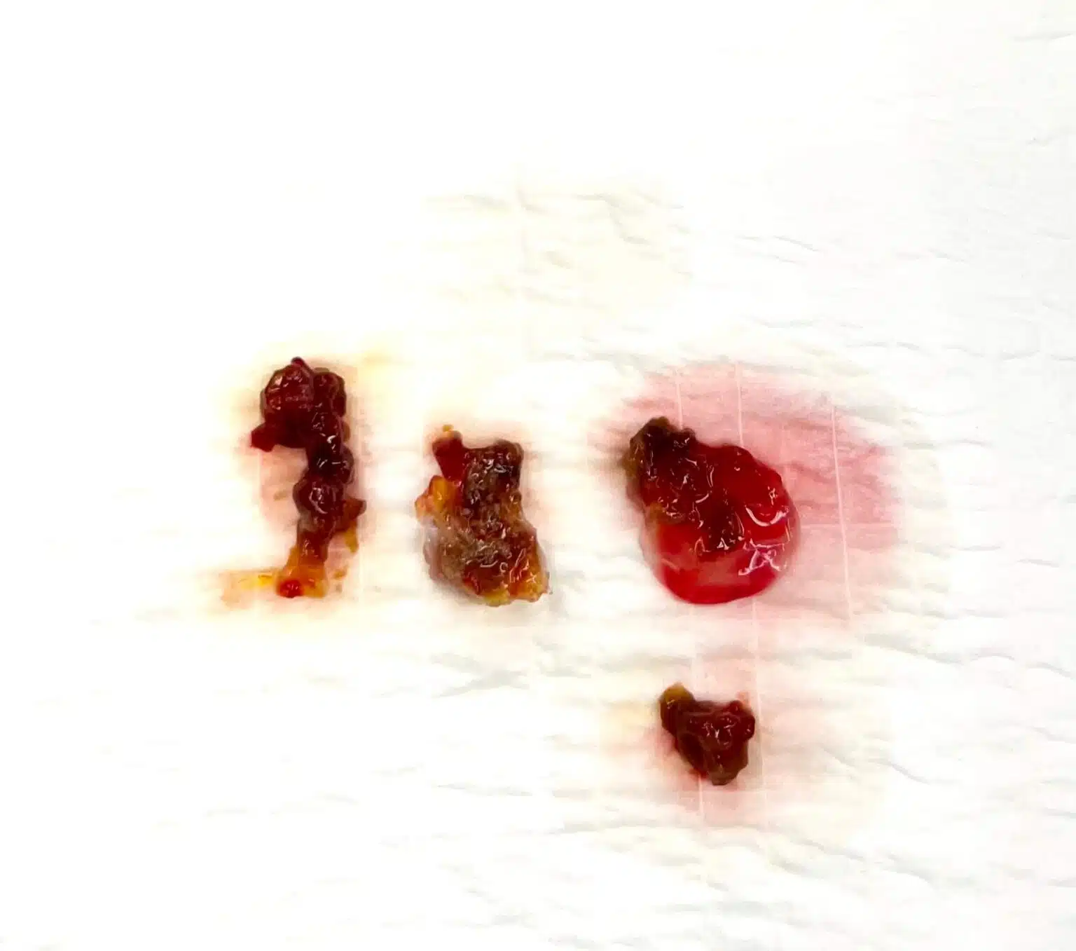 Given the high embolic risk from the mobile fragments, the patient was referred for urgent surgical resection. The mass was removed en bloc along with its attachment site on the atrial wall. The specimen was fragile and required careful handling to avoid fragmentation during excision.
