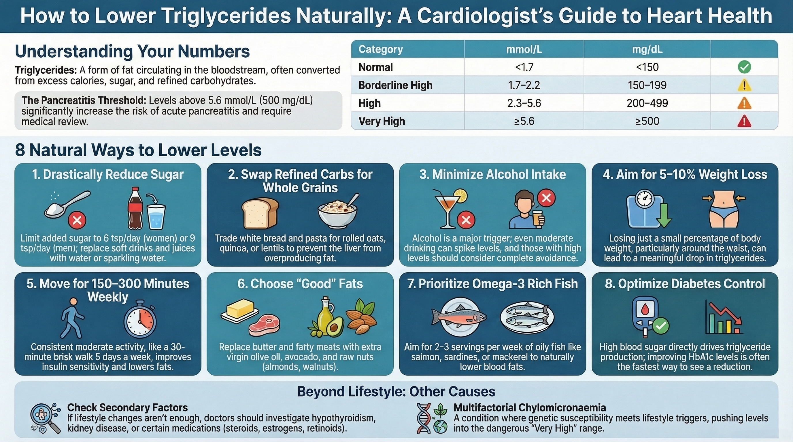 Rare inherited disorders such as familial chylomicronaemia syndrome (FCS) can cause extremely high triglyceride levels from childhood. These patients usually need specialist management and very strict dietary fat restriction. (For more on genetic lipid conditions, see our article on familial hypercholesterolemia.)